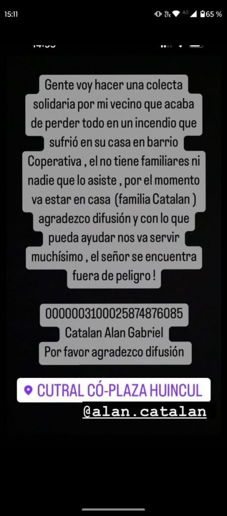 En principio, se informó que ya fue asistido desde la comuna cutralquense, a través de Desarrollo Social. El vecino perdió todo su dinero y documentación. Hubo ya personas solidarias que le acercaron ropa y calzado.