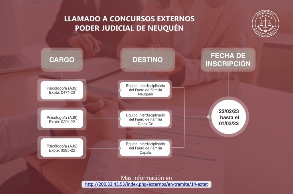 De acuerdo a la información publicada en la cuenta oficial del TSJ se indica que, para el caso de Cutral Co, el llamado es para profesional en Psicología con destino al equipo interdisciplinario en el fuero de Familia.