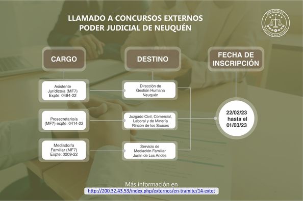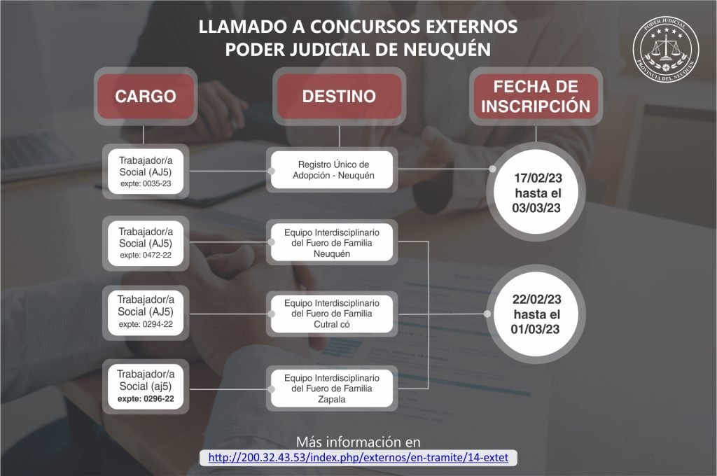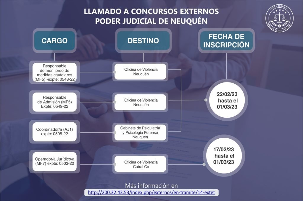 Desde el Tribunal Superior de Justicia se informó que está abierto hasta el 1 de marzo de este año el concurso externo para el ingreso de profesionales destinados a diferentes áreas en el ámbito de la justicia civil tanto para Cutral Co como para el resto de la provincia.