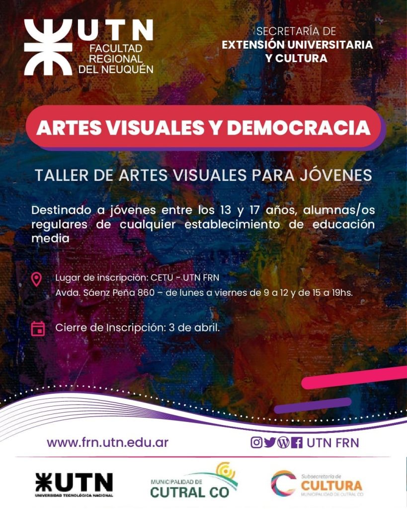 El próximo lunes es el último día para inscribirse al taller denominado “Artes Visuales y Democracia”, impulsado por UTN-FRN mediante la Secretaría de Extensión Universitaria y Cultura.