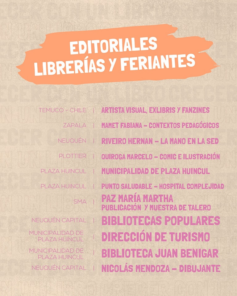 Hoy es la segunda jornada de la feria del Libro en Plaza Huincul, con entrada libre y gratuita. Las actividades previstas para hoy son el taller de escritura creativa a cargo de Griselda Martínez y la presentación de la Fundación Patagonia.