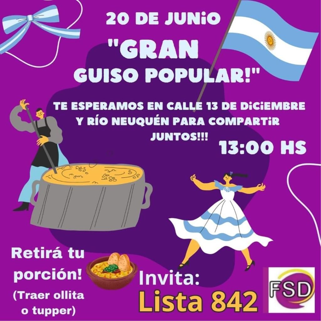Para este martes 20 de junio, día de la bandera un grupo de vecinos de una agrupación política organizó un “gran guiso popular”. Las y los vecinos que quieran una porción pueden concurrir a retirarla de manera gratuita.