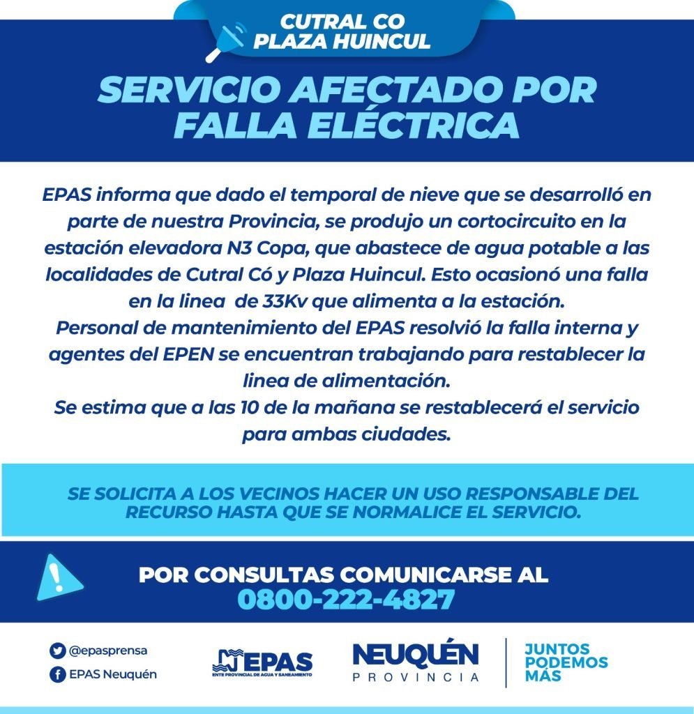 Además indicaron que el personal de mantenimiento del EPAS resolvió la falla interna y los del EPEN están trabajando para restablecer la línea de alimentación.