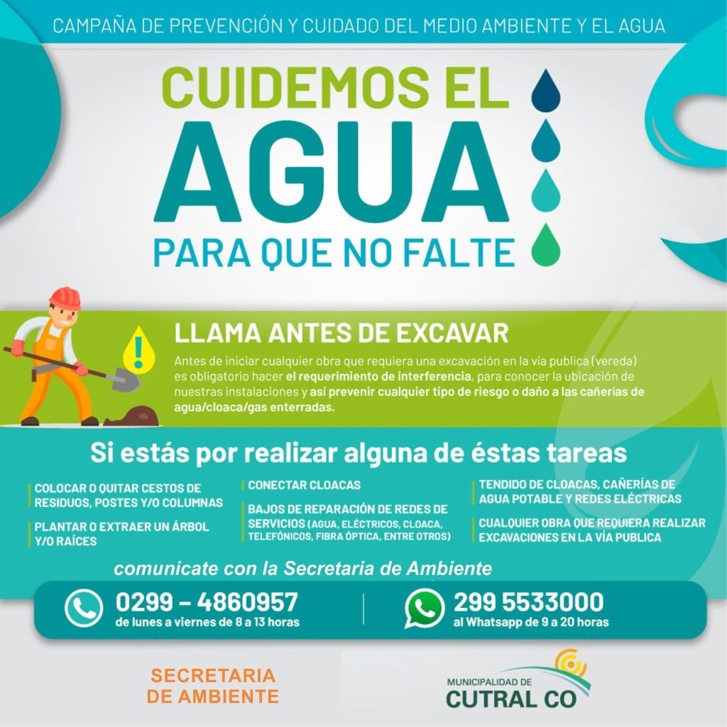 La secretaría de Ambiente de la municipalidad de Cutral Co lanzó un comunicado para prevenir cortes y derrames de agua en la vía pública. En el marco de campaña de prevención y cuidado del medio ambiente y del agua, le solicita a los vecinos que antes de realizar una excavación es obligatorio hacer el requerimiento de interferencia, para prevenir cualquier tipo de riesgo o daño a las cañerías de agua, cloacas y gas.