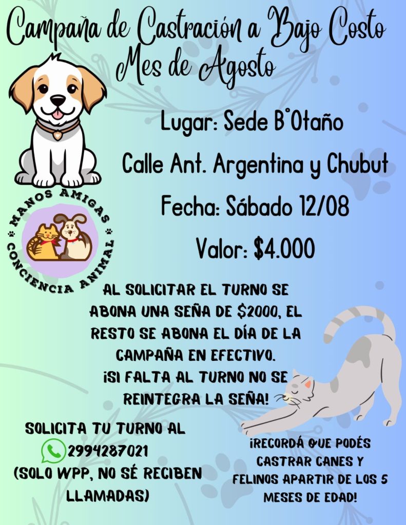 La sede del barrio Otaño en Plaza Huincul se prepara para llevar a cabo una campaña de castración de mascotas, organizada por Manos Amigas y Conciencia Animal, tendrá lugar el próximo sábado 12 de agosto en las calles Antártida Argentina y Chubut.