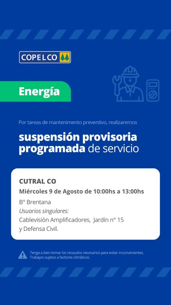 Desde la cooperativa Copelco se informó que este miércoles habrá interrupción en el servicio eléctrico desde las 10 hasta las 13.