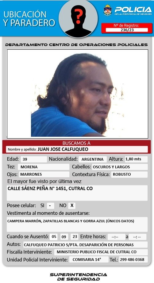 Según el informe emitido por la superintendencia de seguridad de la provincia, Juan José Calfuqueo fue visto por última vez en su domicilio, ubicado en la Calle Sáenz Peña Nº 1451, en Cutral Có. En el momento de su desaparición, el hombre vestía una campera marrón, zapatillas blancas y una gorra azul. Calfuqueo es descrito como una persona de aproximadamente 1,80 metros de altura, cabellos oscuros y largos, tez morena, ojos marrones y contextura física robusta.