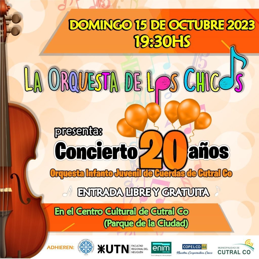Este domingo 15, a las 19:30, la Orquesta Infanto Juvenil de Cuerdas celebrará sus 20 años de vida con un concierto. La cita es en el Centro Cultural ubicado en el Parque de la Ciudad, en Cutral Co. La entrada es libre y gratuita y empezará con puntualidad.