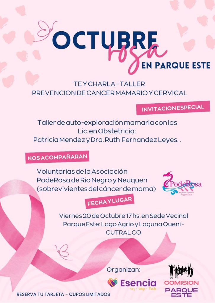 La jornada tendrá lugar el viernes 20 de octubre a partir de las 17:00 horas en la sede vecinal Parque Este de Cutral Co, situada en la intersección de Lago Agrio y Laguna Queni. Contará con la participación de profesionales en el campo de la obstetricia y la medicina, incluyendo la Licenciada en Obstetricia Patricia Méndez y la Dra. Ruth Fernández Leyes, quienes ofrecerán charlas informativas sobre el cáncer de mama, su prevención y tratamiento.