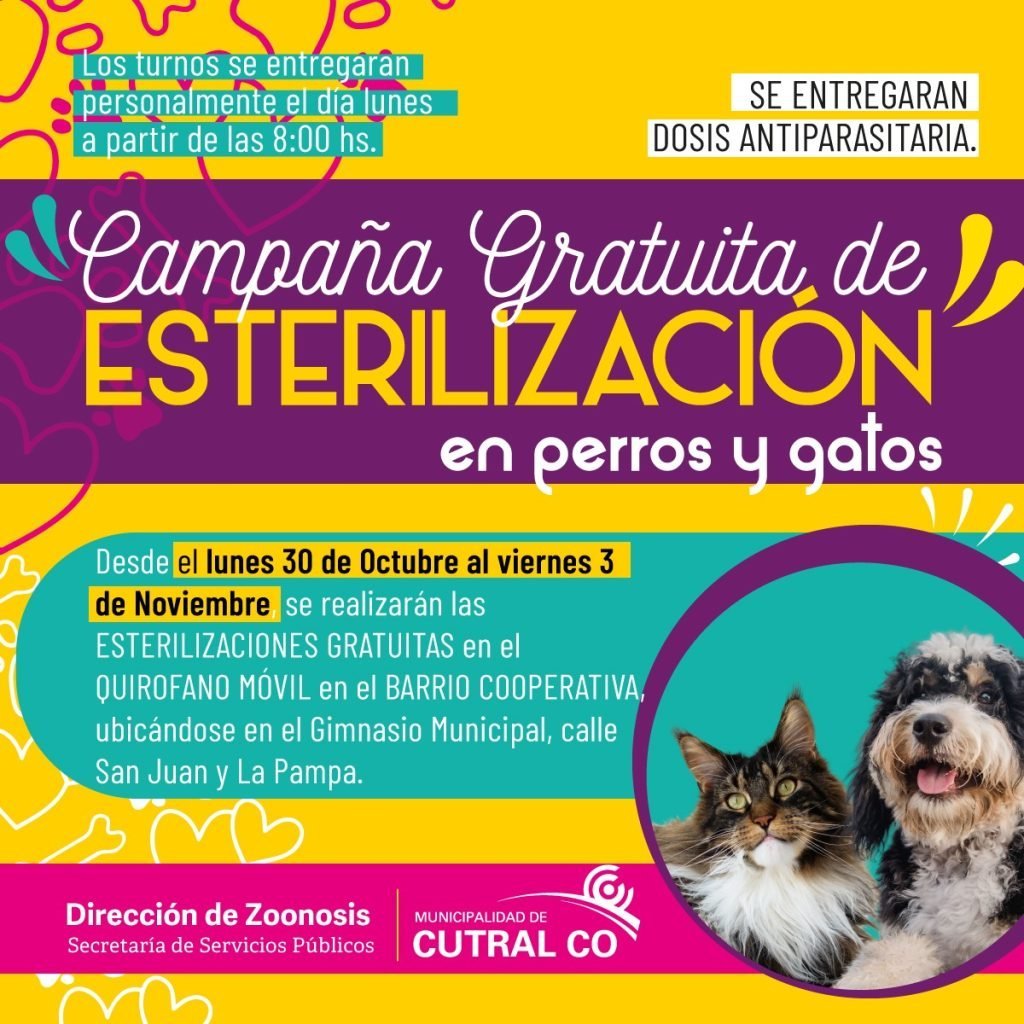 Desde la dirección de Zoonosis se informa a la comunidad que hasta el viernes 3 de noviembre, se realizarán las esterilizaciones gratuitas a través del quirófano móvil. En este caso, en el barrio Cooperativa.