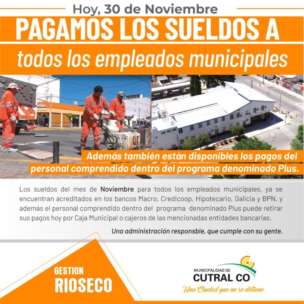 Este jueves 30 de noviembre se abonarán los sueldos para los agentes municipales de Cutral Co. Según se informó estarán además disponibles los pagos para los beneficiarios de planes sociales.
