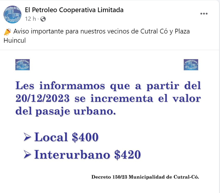La municipalidad local emitió un decreto el pasado miércoles 20 de diciembre que resultó en un aumento en las tarifas de pasajes de la cooperativa de trabajo El Petróleo.