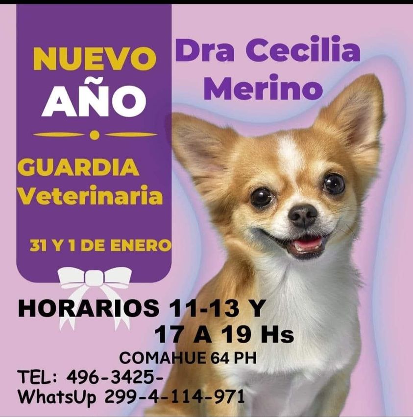 La veterinaria de guardia para este fin de año -domingo 31 y lunes 1 de enero de 2024- estará la veterinaria Cecilia Merino.