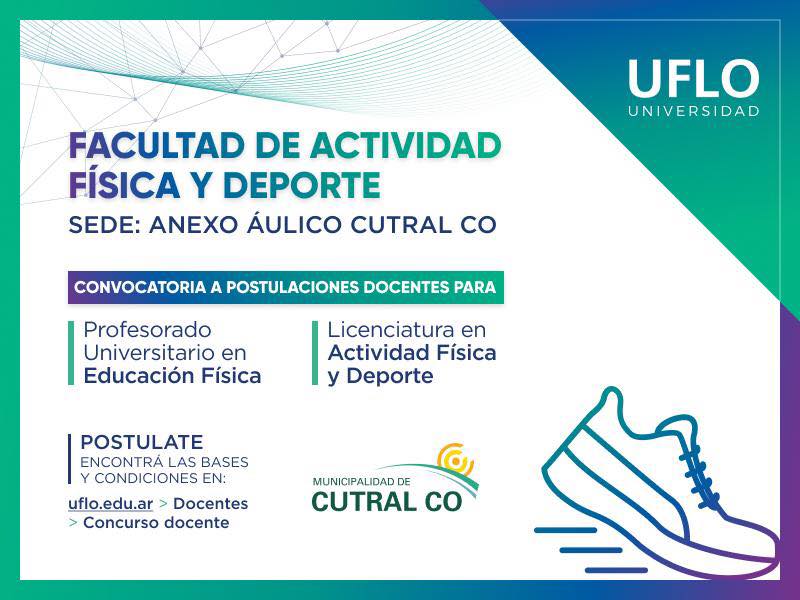 La municipalidad de Cutral Co anunció hoy desde su sede la apertura de la convocatoria para postulaciones docentes en la Universidad de Flores (UFLO), de la facultad de Actividad Física y Deporte. La convocatoria está dirigida para el ciclo lectivo 2024 y abarca las carreras de Profesorado Universitario en Educación Física y Licenciatura en Actividad Física y Deporte.
