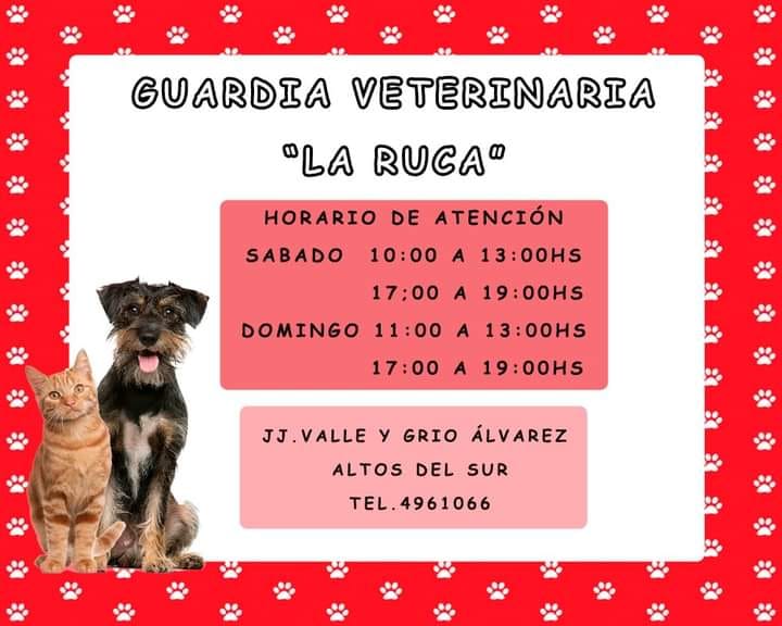 La clínica veterinaria “La Ruca” ubicada en la intersección de las calles JJ Valle y Gregorio Álvarez en Cutral Co, informó a la sobre el servicio de guardia que estará disponible este domingo.