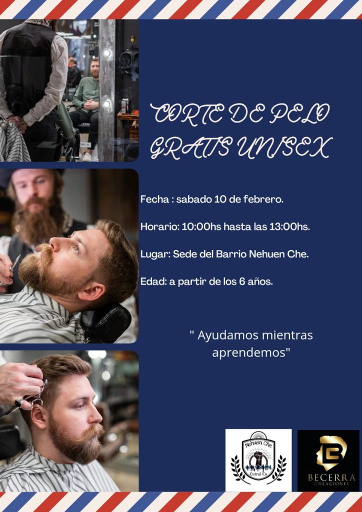 El próximo sábado 10 de febrero, el barrio Nehuen Che realizará una jornada de solidaridad y estilismo. La Comisión Vecinal del barrio anunció la jornada de corte de pelo “Ayudamos Mientras Aprendemos”, en la que el peluquero local, Marcelo Becerra, ofrecerá sus servicios para los vecinos a partir de los 6 años.