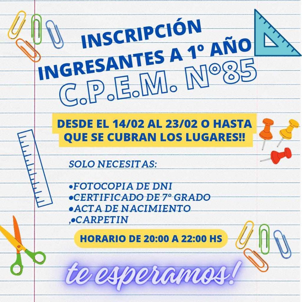 Se informa a toda la comunidad que se dará inicio al proceso de inscripción para aquellos interesados en ingresar al 1° año del CPEM 85 de Plaza Huincul para el ciclo lectivo 2024. Esta convocatoria está dirigida específicamente a la modalidad nocturna.