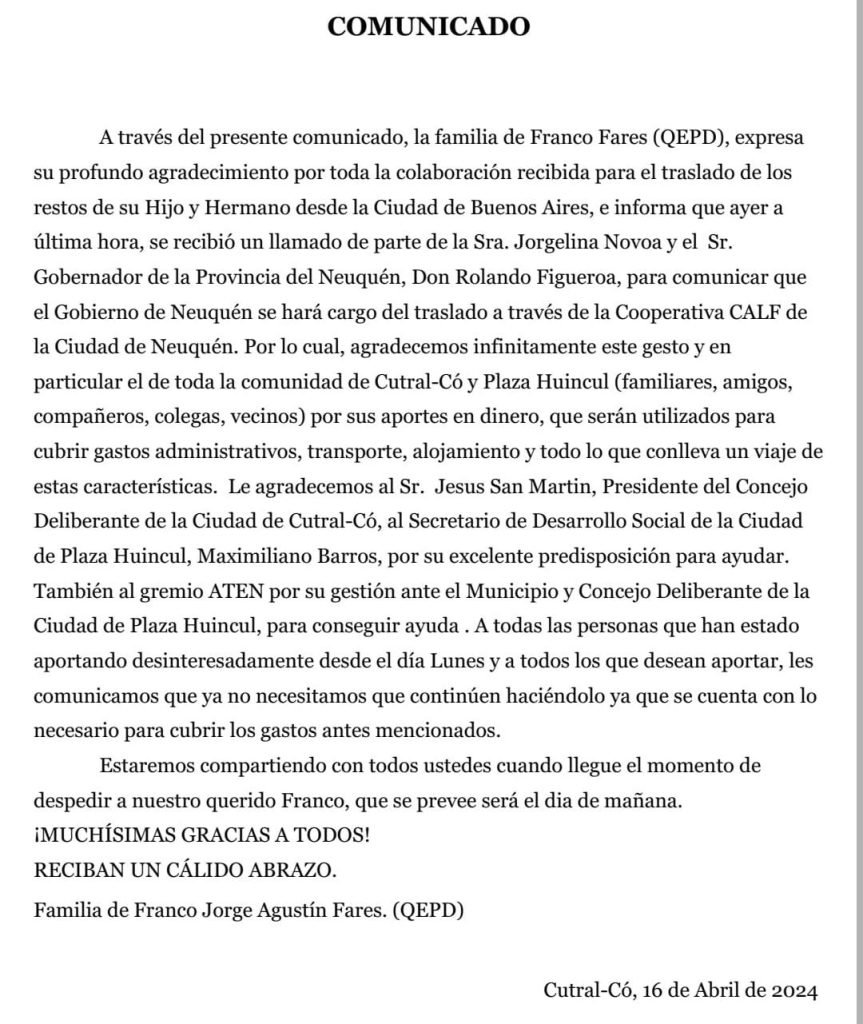 A través de un comunicado oficial, la familia de Franco expresó su profundo agradecimiento por el apoyo recibido. En particular, destacaron el gesto del gobernador de la Provincia del Neuquén, Rolando Figueroa, y de la señora. Jorgelina Novoa, quienes anunciaron que el Gobierno se haría cargo del traslado a través de la Cooperativa CALF de la Ciudad de Neuquén.
