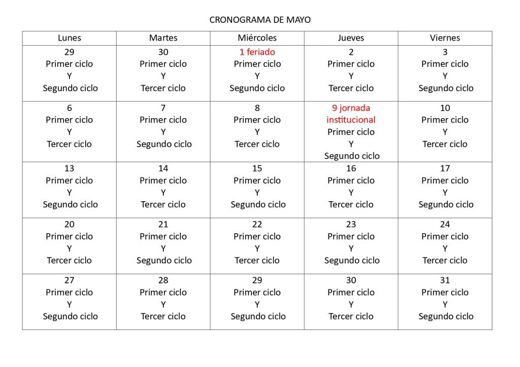 A partir del lunes 29 de abril, las clases se retomarán únicamente para el primer ciclo, mientras que el segundo y tercer ciclo irán rotando en días específicos. Este cronograma de clases se mantendrá durante los últimos días de abril y todo el mes de mayo, sujeto a posibles ajustes según la evolución de la situación.