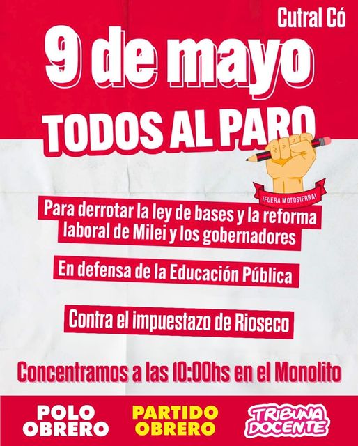 El Partido Obrero, Polo Obrero y Tribuna Docente se convocaron también bajo la consigna: “Para derrotar la ley de Bases, la reforma laboral de Milei y los gobernadores”. Se concentrarán a las 10 en el monolito de avenida del Trabajo y Carlos H Rodríguez para marchar luego con las otras organizaciones.