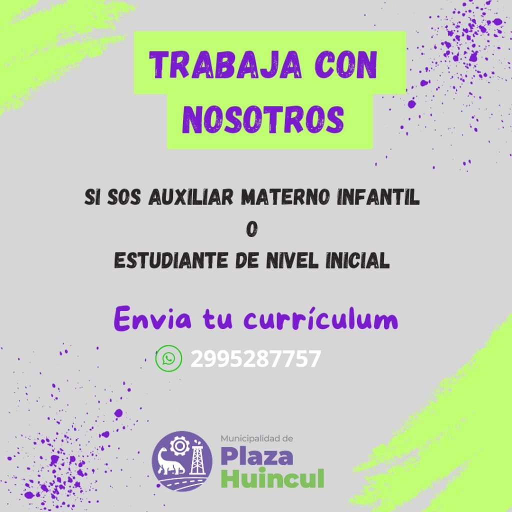 La secretaría de Institucionales de Plaza Huincul informó que el municipio se encuentra en la búsqueda de personal para cubrir el puesto de auxiliar materno infantil o estudiante de nivel inicial, con disponibilidad horaria.