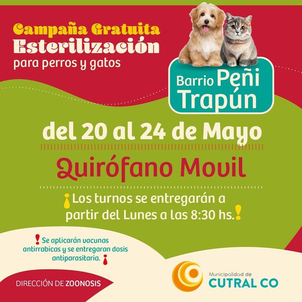 Se llevará a cabo una nueva campaña gratuita de esterilización en el barrio Peñi Trapún de Cutral Co. La iniciativa se desarrollará del 20 al 24 de mayo, con la presencia del Quirófano Móvil, que estará ubicado en la sede del barrio.
