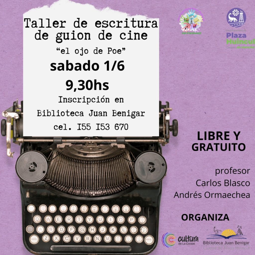El próximo sábado 1 de junio, habrá un taller de escritura de guion de cine titulado “El Ojo de Poe”. Esta actividad, libre y gratuito, está organizada por la biblioteca Juan Benigar y Cultura de La Coope.