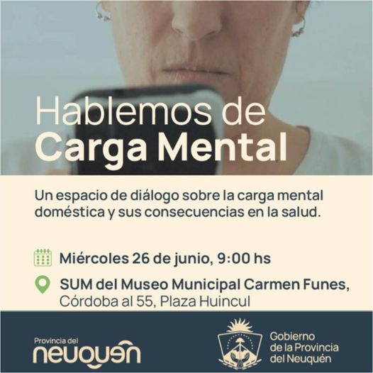 El ministerio de Desarrollo Humano, Gobiernos Locales y Mujeres, a través de la Subsecretaría de las Mujeres, ha organizado una jornada titulada “Hablemos de carga mental”, con el objetivo de sensibilizar y visibilizar la carga mental doméstica y sus consecuencias en la salud, especialmente en las mujeres. El evento se realizará el próximo miércoles 26 de junio a las 9:00 horas en la Sala Alicia Fernández Rego, ubicada en Vuelta de Obligado 25, en la ciudad de Neuquén.