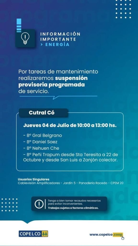 La cooperativa de Copelco informó a la comunidad de Cutral Co que se llevará a cabo una suspensión programada del servicio de energía eléctrica. Esta interrupción temporal se llevará a cabo el jueves 4 de julio, en el horario comprendido entre las 10:00 y las 13:00 horas.