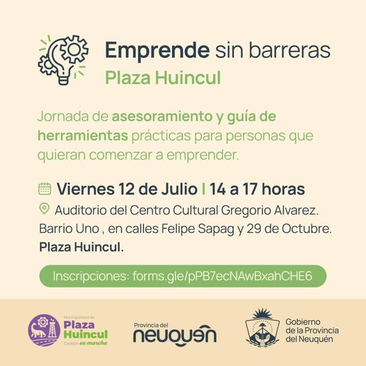 El próximo viernes 12 de julio se llevará a cabo una jornada de asesoramiento y guía de herramientas prácticas para emprendedores en el Centro Cultural Gregorio Álvarez de Plaza Huincul. La actividad, organizada por la subsecretaría de Economía Social y la municipalidad de Plaza Huincul, se desarrollará de 14:00 a 17:00 horas.
