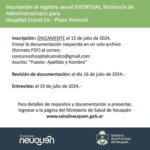 El Hospital Cutral Co y Plaza Huincul anunció la apertura del registro anual para la posición eventual de Técnico/a Administrativo/a. La inscripción se realizará el próximo 15 de julio, brindando una única oportunidad a los interesados en formar parte del equipo administrativo de este importante centro de salud de la región.