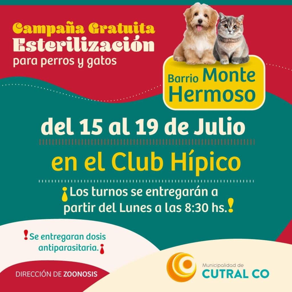 La castración de mascotas en el quirófano móvil será en el club hípico del barrio Monte Hermoso de Cutral Co, desde el lunes 15 hasta el viernes 19 de julio.