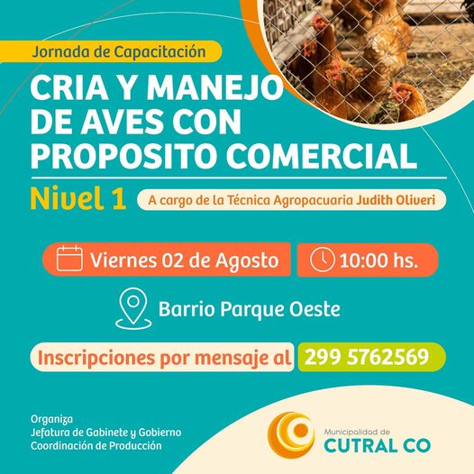 El próximo viernes 2 de agosto, en el Barrio Parque Oeste, habrá una capacitación destinada a todos los interesados en la cría y manejo de aves con fines comerciales. La actividad, organizada por la Técnica Agropecuaria Judith Oliveri, se llevará a cabo a las 10:00 horas.