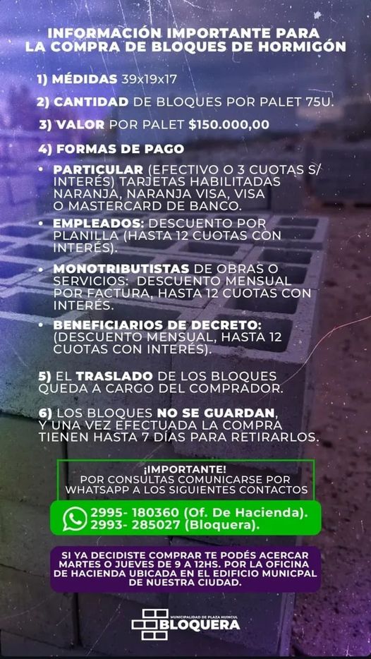 Para realizar consultas o adquirir los bloques, los interesados deben comunicarse a través de WhatsApp a los números 2995-180360 (Oficina de Hacienda) o 2993-285027 (Bloquera). Las compras se pueden concretar los martes o jueves, entre las 9 y 12 horas, en la oficina de Hacienda ubicada en el edificio municipal de Plaza Huincul.