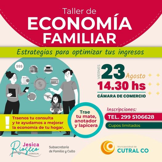 Con el objetivo de brindar herramientas clave para mejorar la economía doméstica, el municipio de Cutral Co organizó un taller denominado “Estrategias para Optimizar tus Ingresos – Taller de Economía Familiar.” Este evento, dirigido a la comunidad, se realizará el próximo viernes 23 de agosto a las 14:30 horas en la sede de la Cámara de Comercio.