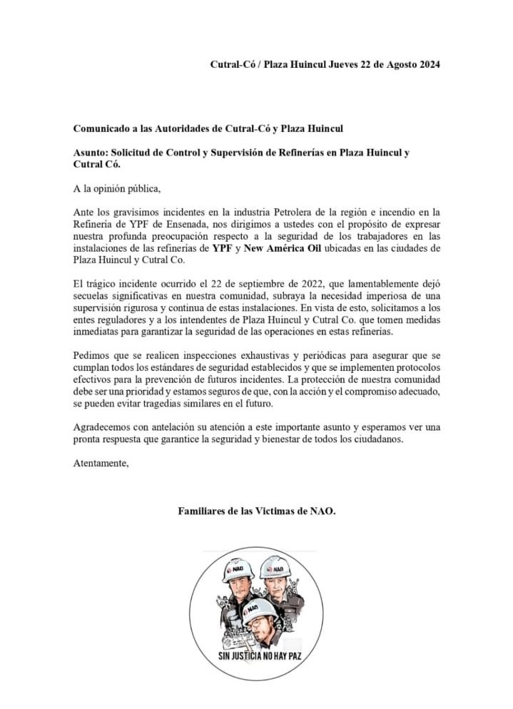 Los familiares de Víctor Herrera, Fernando Jara y Gonzalo Molina, que murieron en la explosión de la destilería NAO, en Plaza Huincul exigieron a los entes y autoridades que haya controles exhaustivos para evitar nuevas tragedias.