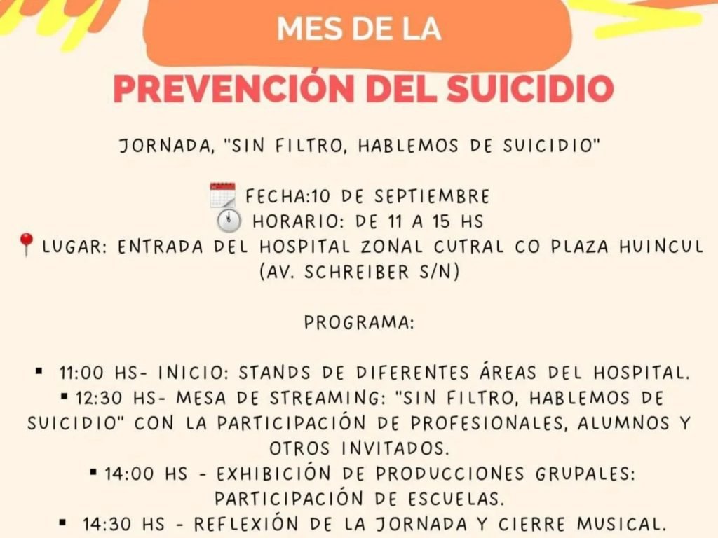 En el marco del Mes de la Prevención del Suicidio, el hospital Zonal Cutral Co y Plaza Huincul invita a la comunidad a participar de la jornada “Sin Filtro, Hablemos de Suicidio”, que se llevará a cabo el próximo 10 de septiembre en la entrada del hospital, ubicado en Av. Schreiber. El evento, que busca generar conciencia y fomentar el diálogo sobre la prevención del suicidio, se desarrollará de 11:00 a 15:00 horas.