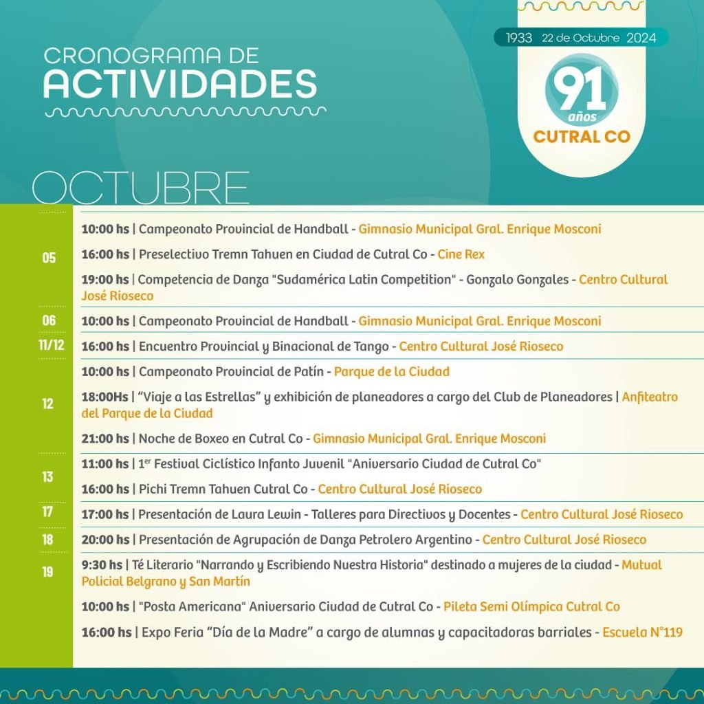 Desde el 5 de octubre comienzan las actividades con el campeonato de handball en el gimnasio municipal, y el preselectivo del Tremn Tahuen local. Y se hará en el Centro Cultural una competencia de danzas “Sudamericana Latin Competition”.