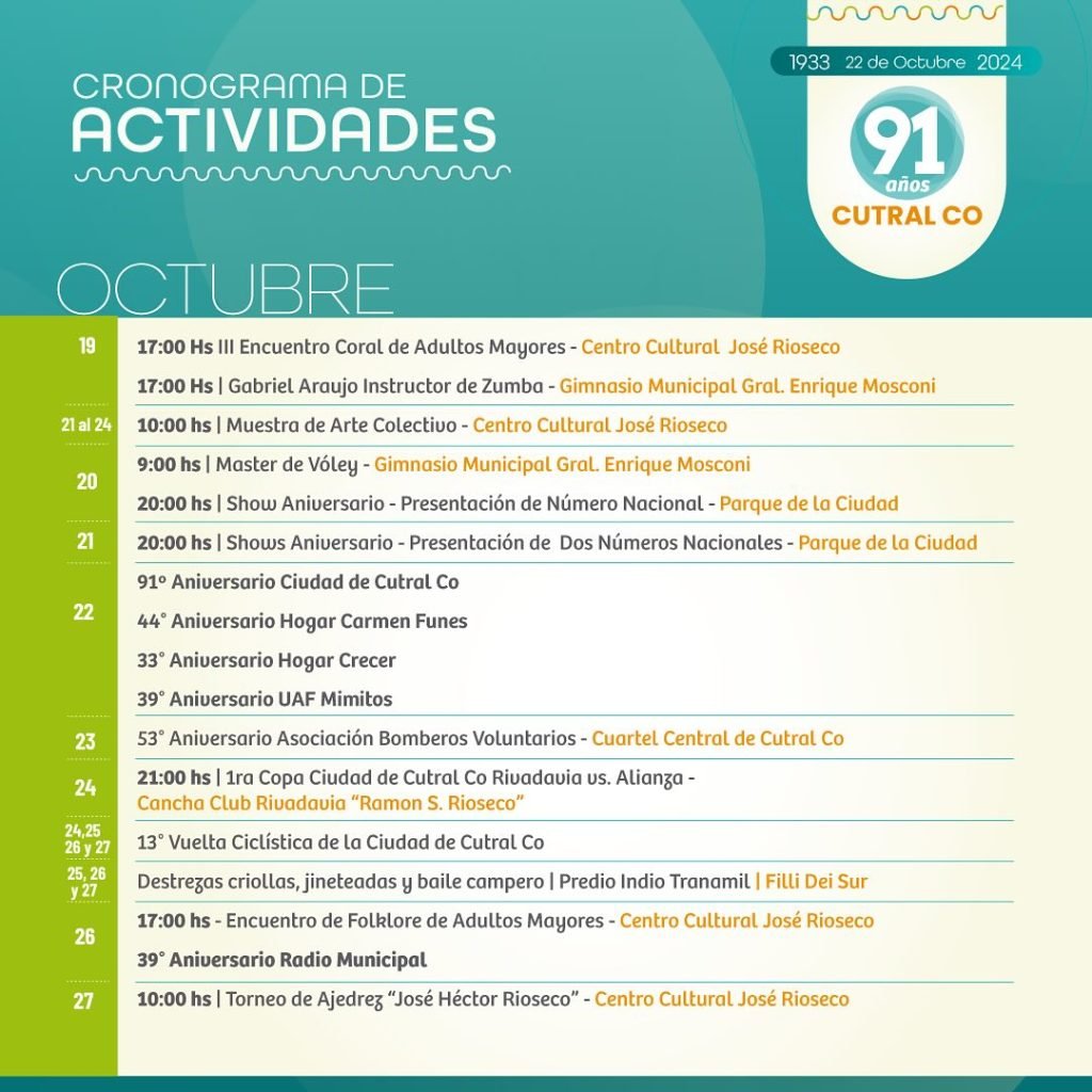 El municipio mantiene en suspenso los nombres de los artistas que vendrán para el aniversario de Cutral Co, pero se anuncian tres recitales, uno el 20 de octubre a las 20 y otros dos el 21 de octubre, todo en el Parque de la Ciudad.