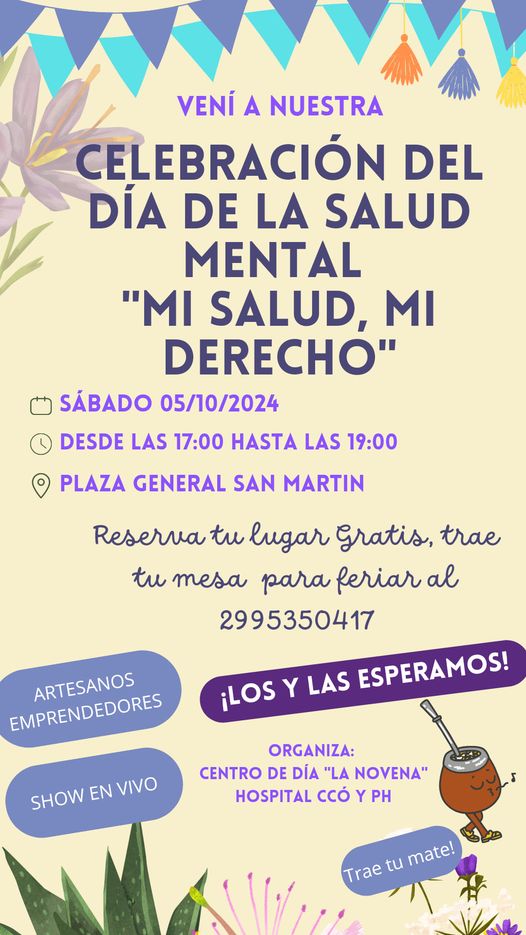El próximo sábado 5 de octubre de 2024, la Plaza General San Martín será el escenario de una importante celebración en conmemoración del Día de la Salud Mental. Bajo el lema “Mi Salud, Mi Derecho”, el evento, organizado por el Centro de Día “La Novena” y el Hospital de Cutral Co y Plaza Huincul, se realizará de 17:00 a 19:00 horas y será de acceso libre y gratuito en la plaza general san Martín de Cutral Co.