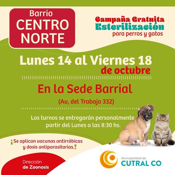 La dirección de Zoonosis de la municipalidad de Cutral Co anunció una nueva campaña de esterilización gratuita y entrega de dosis antiparasitaria en el barrio Centro Norte.