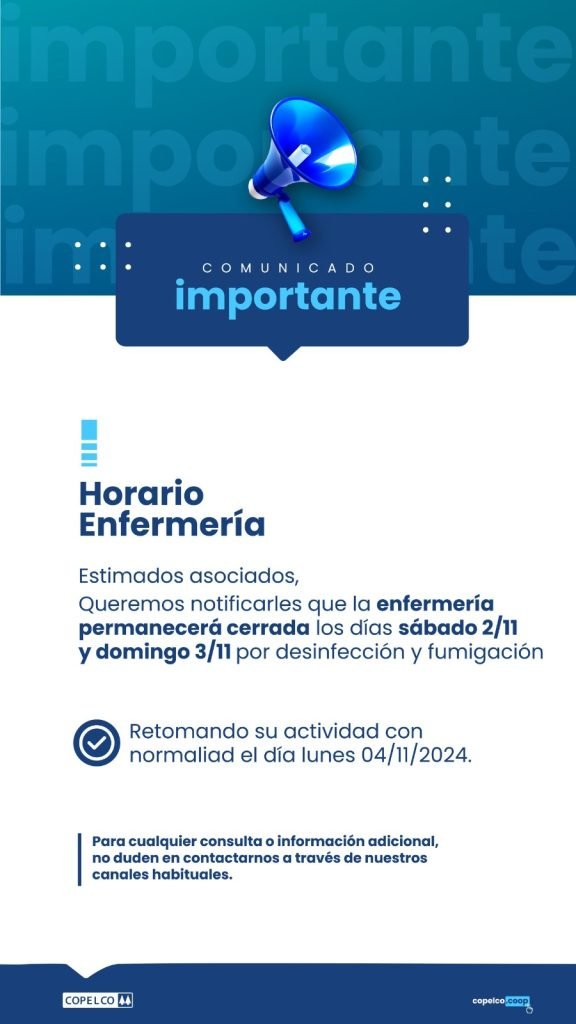 Desde la cooperativa Copelco se informó que este fin de semana no abrirá la enfermería de Copelco en Cutral Co. La razón del cierre para el sábado y el domingo, es por las tareas de desinfección y fumigación.
