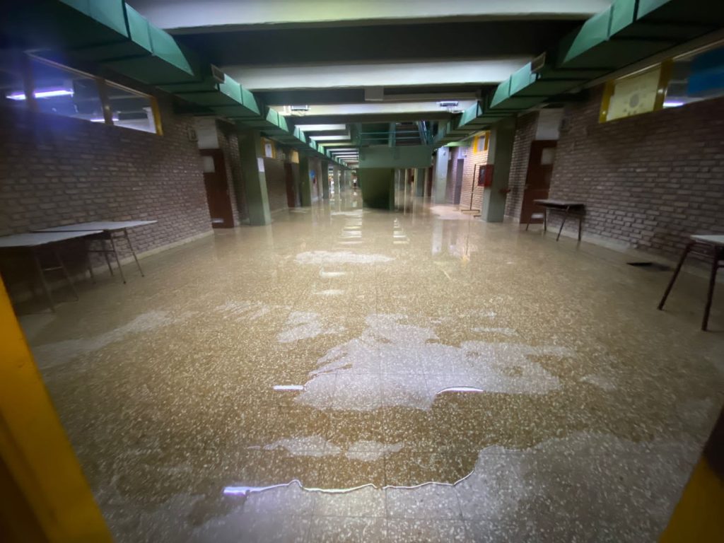 El edificio donde funcionan los CPEM N° 58 y el N° 85 durante la noche, resultó anegado. Las fotografías que enviaron desde el interior de las instalaciones daban cuenta de la cantidad de agua caída.