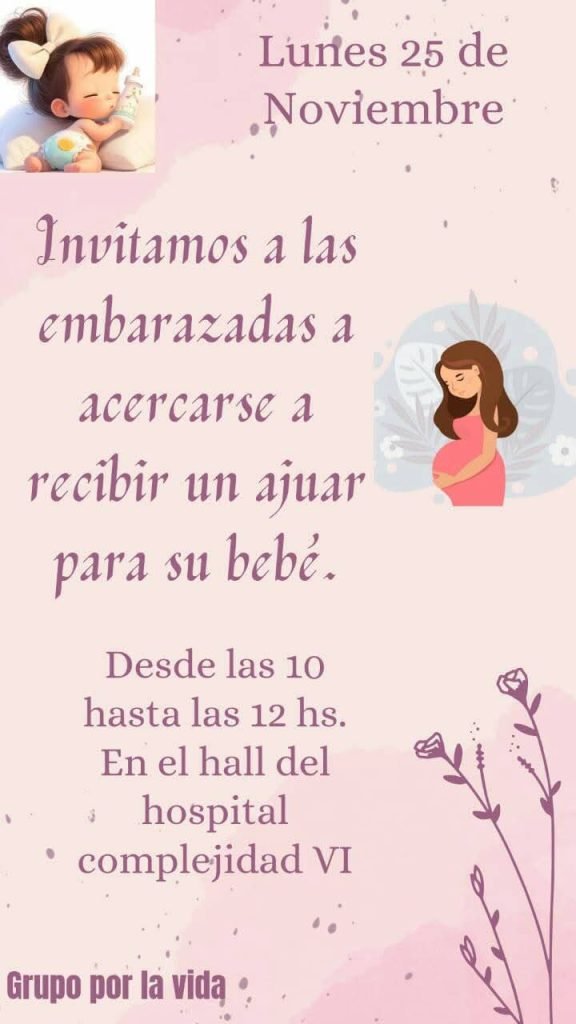 El Grupo por la Vida invita a todas las embarazadas de la comunidad a acercarse este lunes 25 de noviembre, para recibir un ajuar para su bebé. La actividad se llevará a cabo en el hall del Hospital de Complejidad VI, ubicado en Plaza Huincul, desde las 10:00 hasta las 12:00 horas.