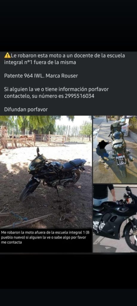 El docente afectado solicita la colaboración de la comunidad para localizar el vehículo. Si alguien tiene información sobre su paradero o logra identificarla, puede comunicarse al número 299-5516034.