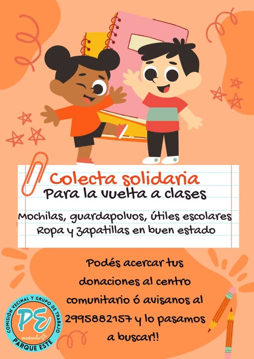 La Comisión Vecinal del barrio Parque Este anunció el lanzamiento de una colecta solidaria destinada a apoyar a las familias en el regreso a clases. La iniciativa busca reunir mochilas, guardapolvos, útiles escolares, ropa y zapatillas en buen estado.