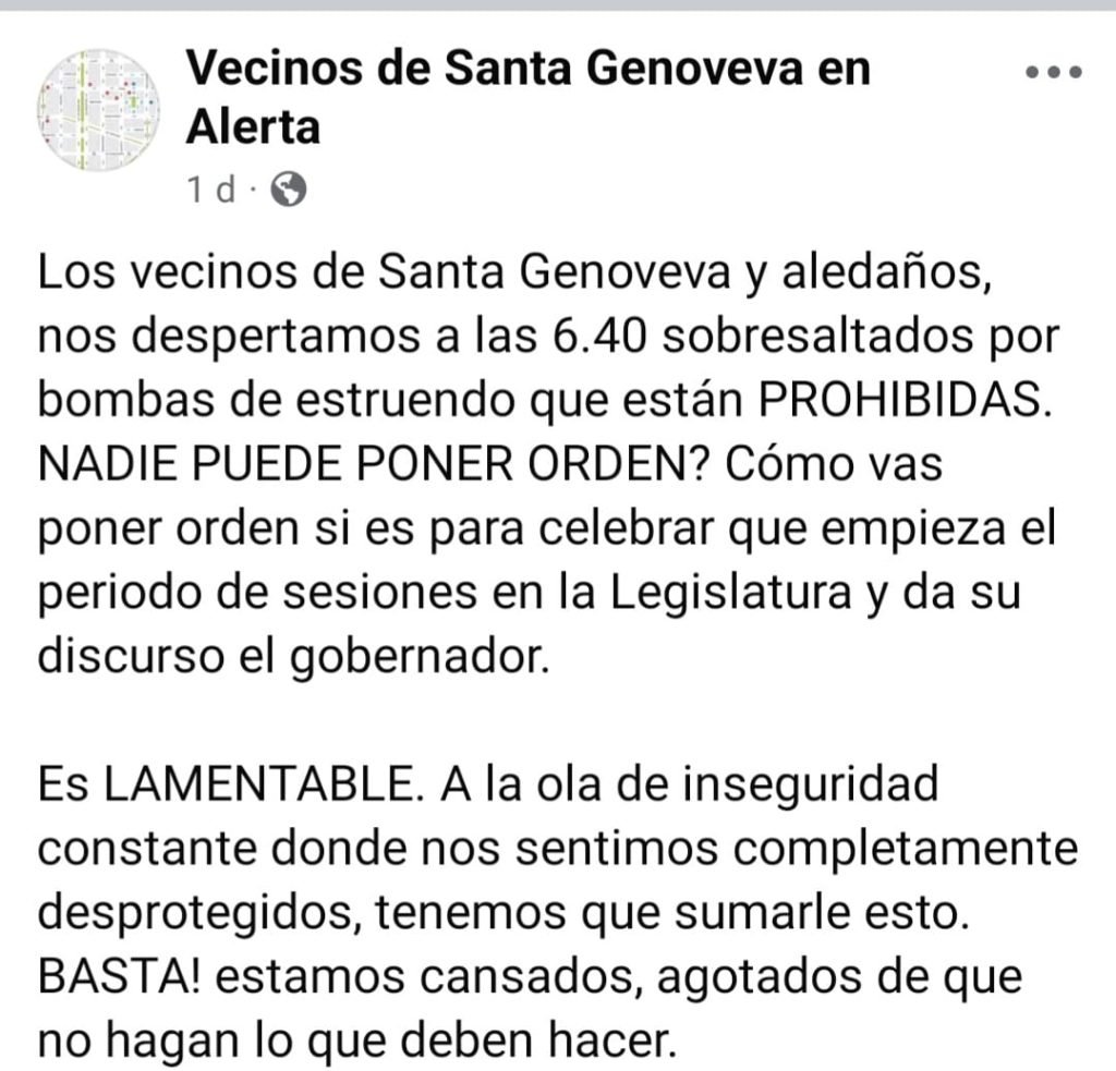 Las redes sociales estallaron con mensajes de indignación. Un vecino escribió en una publicación viral: “Los vecinos de Santa Genoveva y aledaños nos despertamos a las 6:40 sobresaltados por bombas de estruendo que están PROHIBIDAS. ¿NADIE PUEDE PONER ORDEN? ¿Cómo vas a poner orden si es para celebrar que empieza el período de sesiones en la Legislatura y da su discurso el gobernador? Es LAMENTABLE. A la ola de inseguridad constante, donde nos sentimos completamente desprotegidos, tenemos que sumarle esto. ¡BASTA! Estamos cansados, agotados de que no hagan lo que deben hacer”.