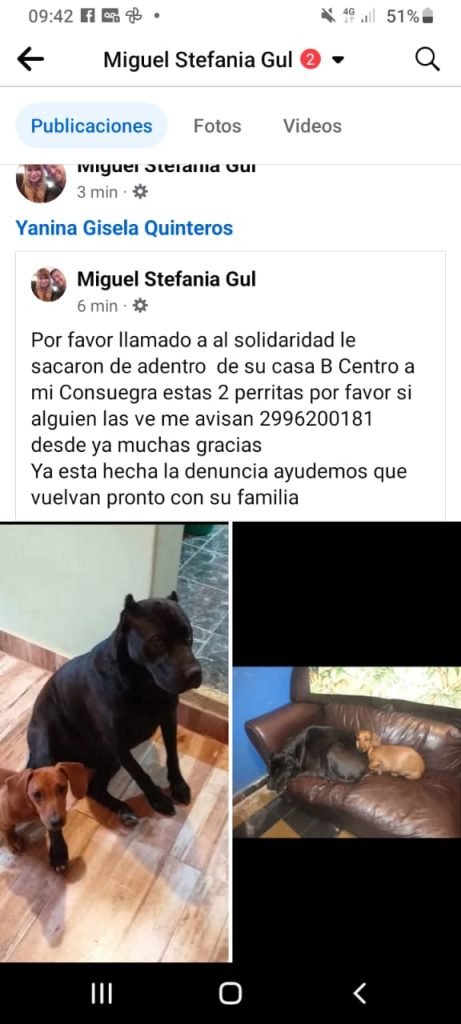 Las mascotas, que forman parte del hogar de sus dueños, fueron sacadas de la propiedad en circunstancias aún no esclarecidas. Ante esta situación, se inició una campaña de búsqueda y difusión en redes sociales con el objetivo de obtener información sobre su paradero. Cualquier información contactarse al número 2996200181