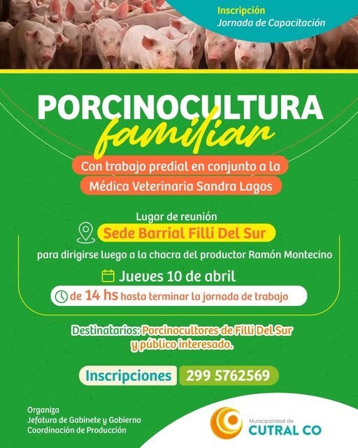 El próximo miércoles 10, habrá una jornada de capacitación en porcinocultura familiar. Se indicó que la capacitación estará a cargo de la médica veterinaria Sandra Lagos.