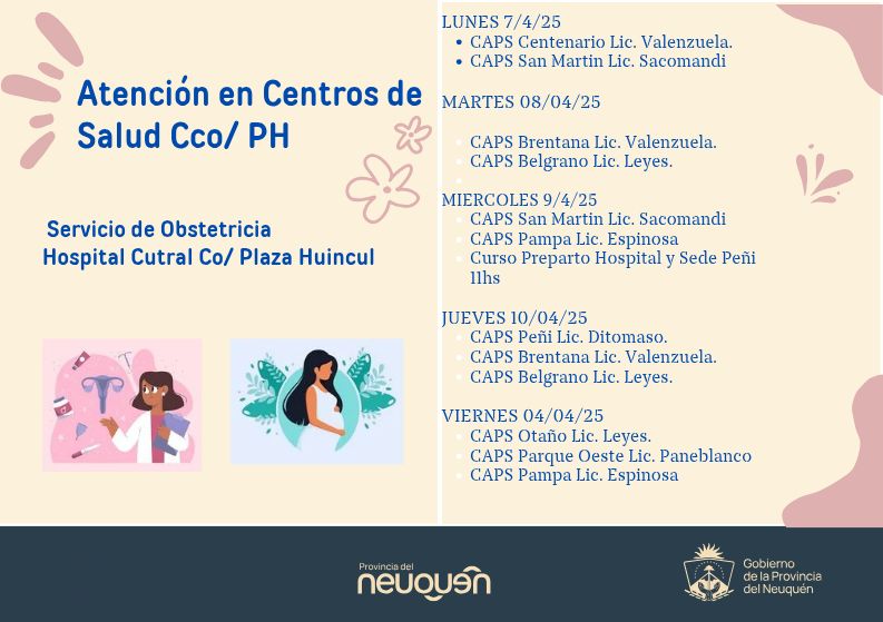 Durante la semana del 7 al 11 de abril, el Servicio de Obstetricia del Hospital Cutral Co y Plaza Huincul continuará brindando atención descentralizada en los distintos Centros de Atención Primaria de la Salud (CAPS) de ambas ciudades. El cronograma semanal contempla la presencia de las licenciadas en obstetricia en diferentes barrios, garantizando el acceso y la continuidad del cuidado prenatal para embarazadas y personas gestantes.